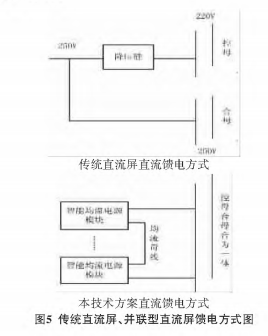 傳統(tǒng)直流屏控母和合母由于電壓不共同,負載要嚴格區(qū)別,比如,微機保護.指示燈等有必要接入控母,斷路器分合閘、儲能電機等負載有必要接人合母。本文所論述的技能控母和合母的電壓等級共同,并聯輸出,可互用,便利用戶的使用。傳統(tǒng)直流屏、并聯型直流屏饋電方法,如圖5所示。